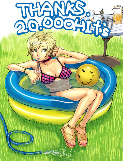 1girlbikiniblonde hairblue eyesbreastsdrinkdrinkingfemale focuslarge breastsmilestone celebrationsandalsshort hairsoloswimsuitwading pool