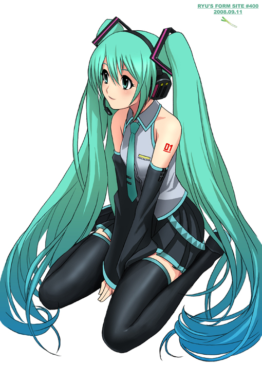 1girlaqua eyesaqua hairbetween thighsdetached sleevesfemale focusheadphoneslong hairmicrophoneminiskirtnecktiesittingskirtsmilesolothighhighstwintailsv armswarizazettai ryouiki