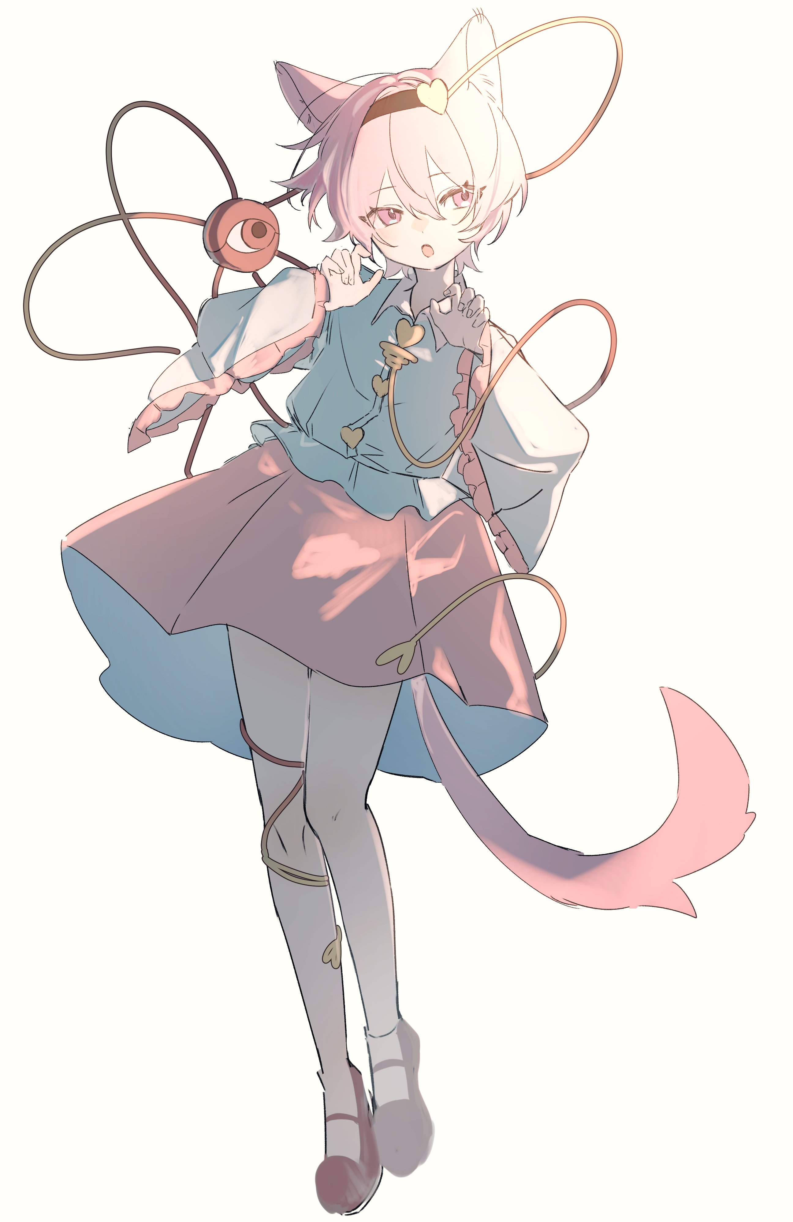 1girlbare legsblack hairbandbloomblue shirtbuttonsdot nosedouble-parted bangseyeballfingernailsfrillsfull bodyhair between eyeshair ornamenthairbandhand upheartheart buttonheart hair ornamentkemonomimi modelegs togetherlong sleeveslooking to the sideopen mouthpink eyespink hairpink skirtshirtshort hairsimple backgroundskirtsolothird eyetsurimewhite backgroundwide sleeves