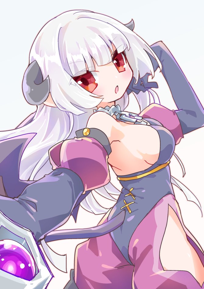 1girlback cutoutbat wingsblack glovesblack leotardblack wingsbreastschainclothing cutoutelbow glovesfrom behindgloveshornslarge breastsleotardlooking backopen mouthpantspulish (eco)purple pantsred eyesside slitsilver chokersolotailwhite hairwings