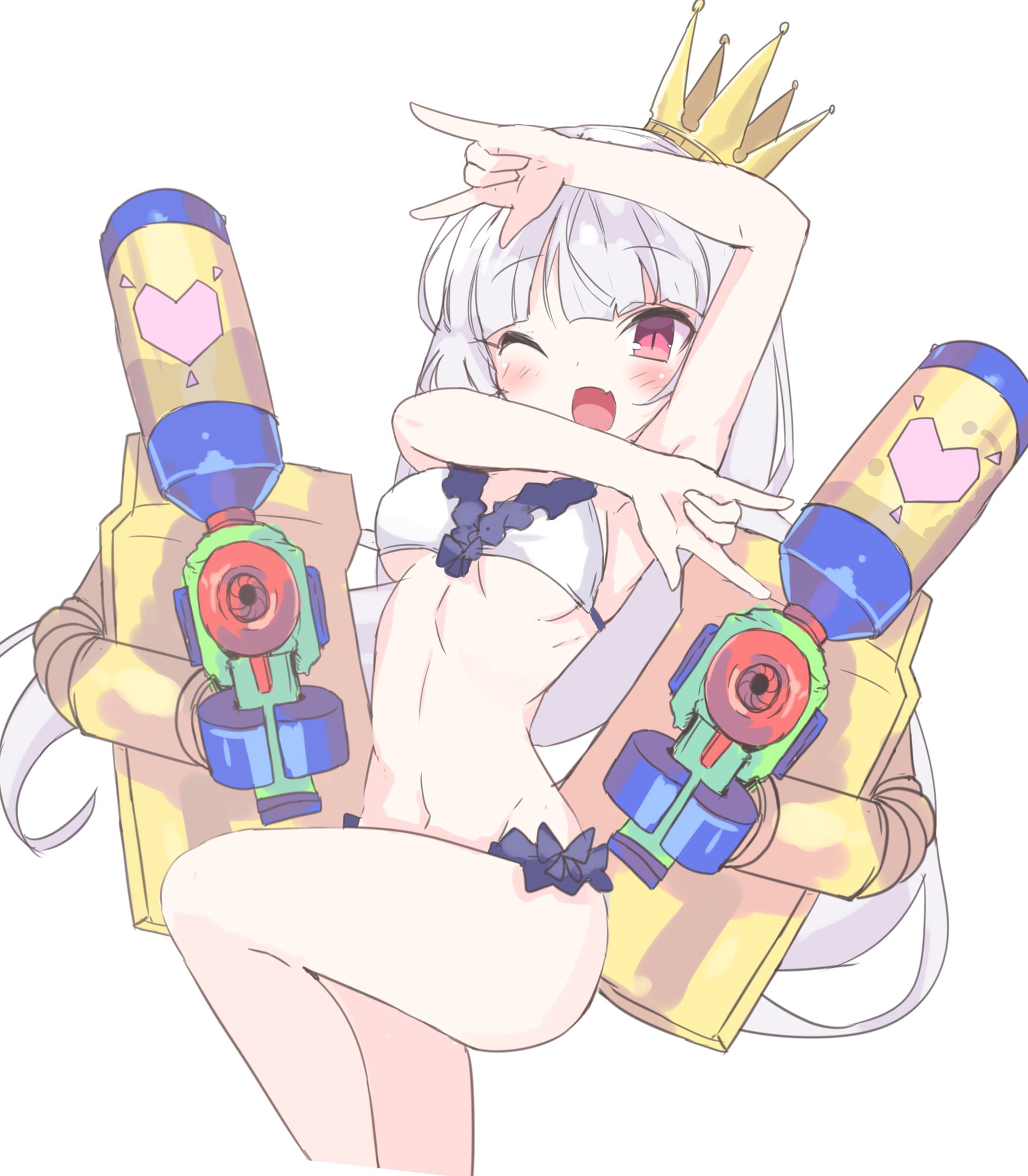 1girlarm upbikinibreastscrownfrilled bikinifrillslong hairmachinerymedium breastsone eye closedopen mouthred eyessoloswimsuitwater gunwhite backgroundwhite bikiniwhite hair