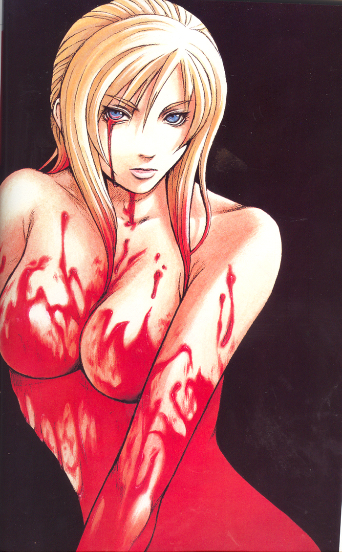 1girlbleedingblonde hairbloodblood on breastsblue eyesbreastscleavagefemale focusinjurynudesolo