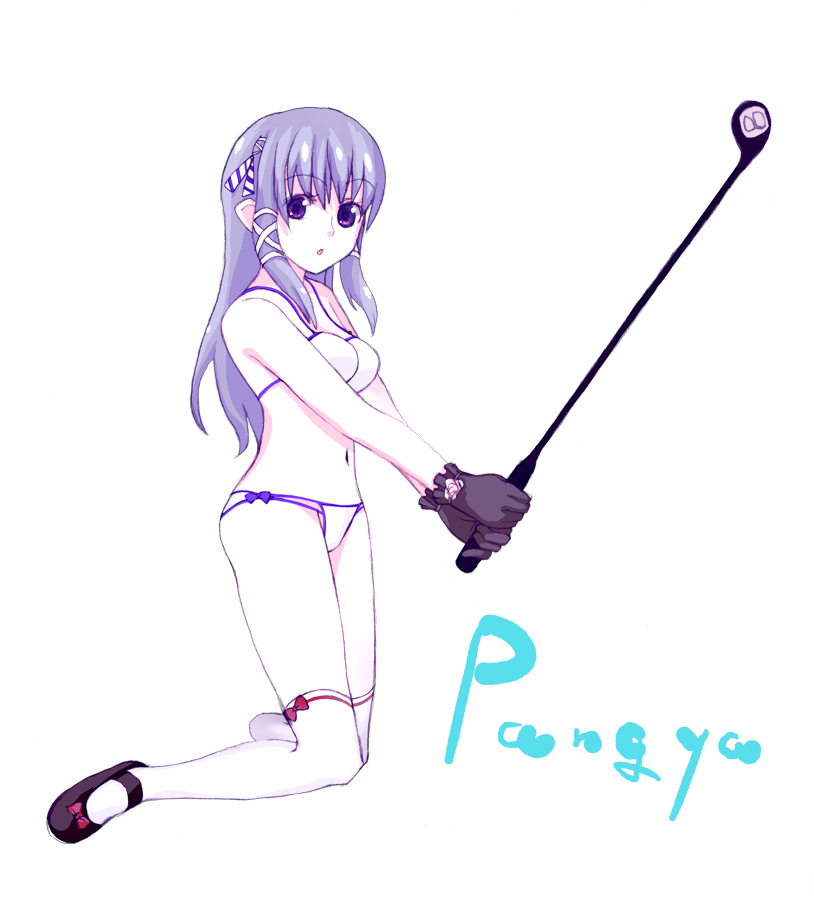 1girlbikiniblack glovesblue eyesblue hairfemale focusglovesgolf clubhair ornamentkneelinglong hairmatching hair/eyesnavelribbonsockssoloswimsuitwhite socks