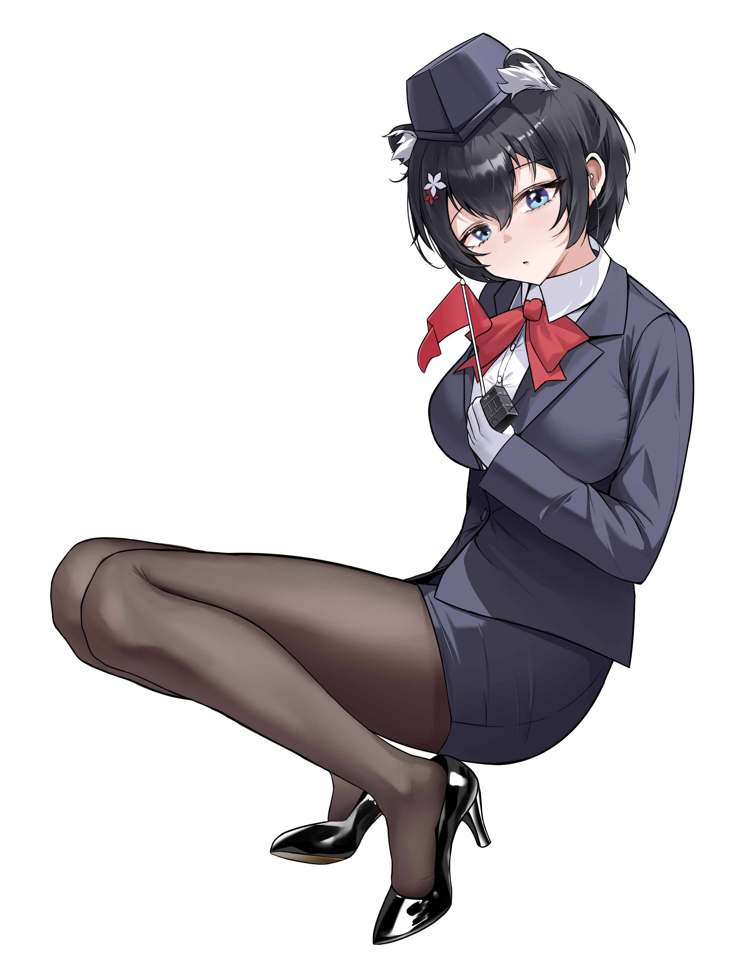 1girlanimal earsblack hairblack hatblack jacketblack pantyhoseblack shoesblack skirtblue eyesbreastsfull bodyhathigh heelsholdingholding walkie-talkiejacketlooking at viewerofficial alternate costumepantyhoseparted lipsshirtshoessimple backgroundskirttour guidewalkie-talkiewhite backgroundwhite shirt