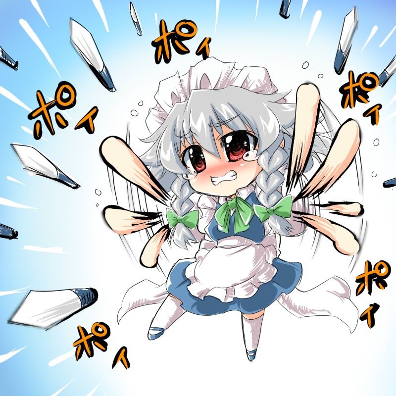 1girlblushbraidchibifemale focusgradient backgroundknifemaidred eyesribbonshort hairsolotearsthrowing knifeweaponwhite background