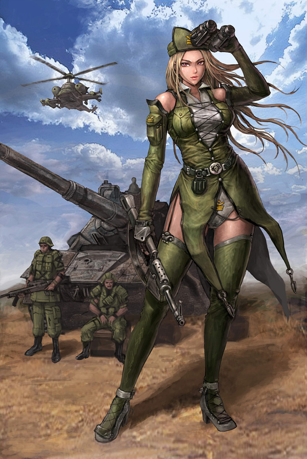 1girlaircraftblonde hairclouddayfemale focusgunhelicopterhigh heelslong hairmilitarymilitary vehiclemotor vehiclepink eyesrifleshoesskysoldiersolotankthighhighsweapon