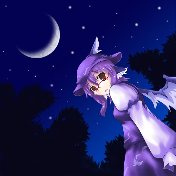 1girlbespectacledcrescent moonfemale focusglasseshatmoonnightnight skypurple hatred-framed eyewearskysolostar (sky)star (symbol)starry skywings