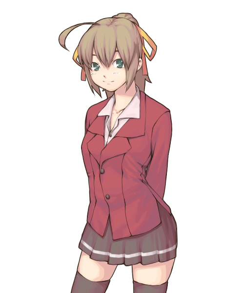 1girlahogebrown hairfemale focusgreen eyesschool uniformserafukusimple backgroundskirtsmilesolostandingthighhighs