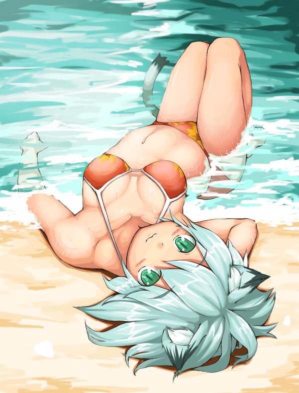 :31girlanimal earsaqua hairbeachbikiniblushbreastsdaygreen eyeslarge breastslyingoceanoutdoorsshort hairswimsuittailwater