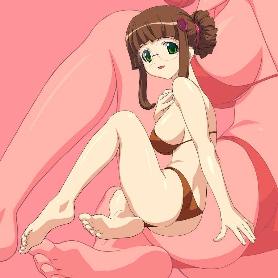 00s1girlbarefootbreastsbrown hairdonut hair bunfeetfemale focusglassesgreen eyeshair bunlarge breastslingeriesideboobsittingsolessolounderwearzoom layer