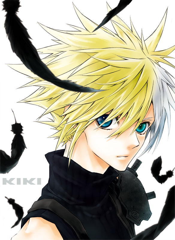 1990s (style)1boyarmorblonde hairblue eyesfalling feathersfeathershair between eyesmako eyesmale focusmulticolored hairretro artstylesleevelesssleeveless turtlenecksolospiked hairturtleneckwhite background