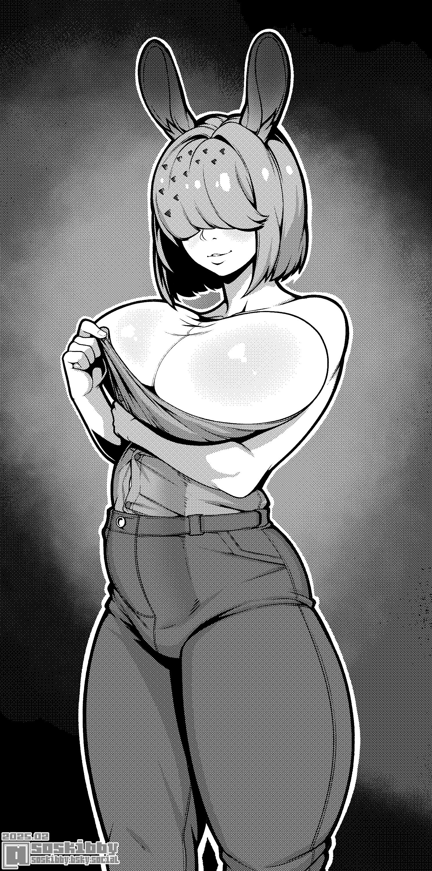 1boyanimal earsartist namebluesky usernamebob cutbreast paddingcowboy shothair over eyesmonochromerabbit earssolostandingtesticlestrap