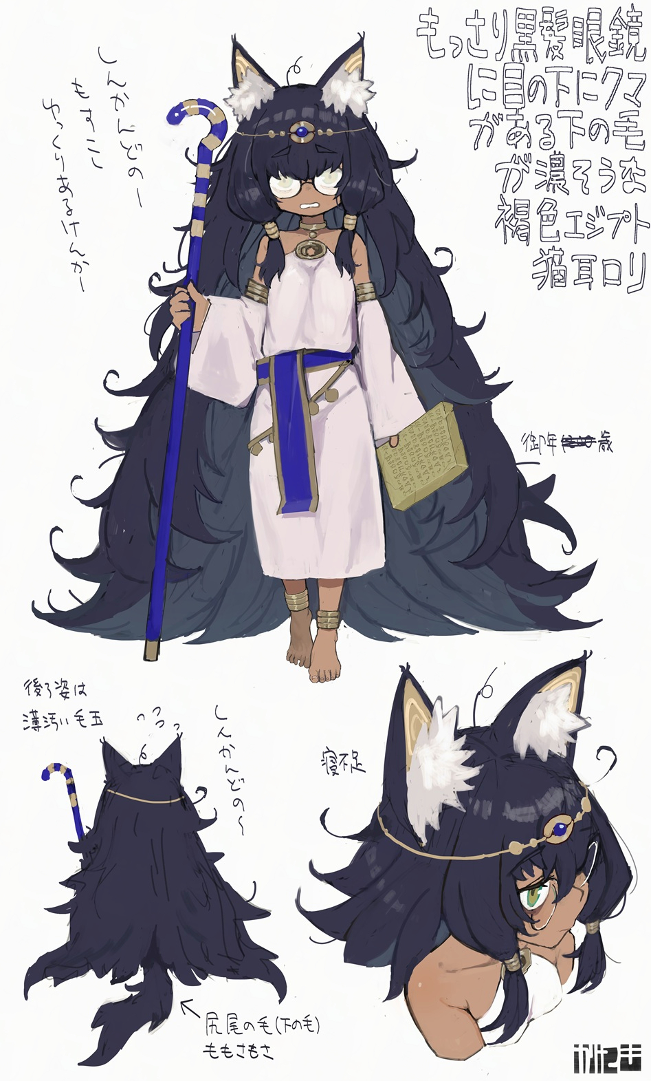 1girlabsurdly long hairahogeancient egyptiananimal ear fluffanimal earsbarefootblack hairblunt bangscat earscat girlcat taildark skindresseyebrows hidden by hairflat chestfull bodyglassesgreen eyesholding stone tabletlong hairlooking at viewerreference sheetround eyewearsolostaffstone tablettailvery long hairwhite dress