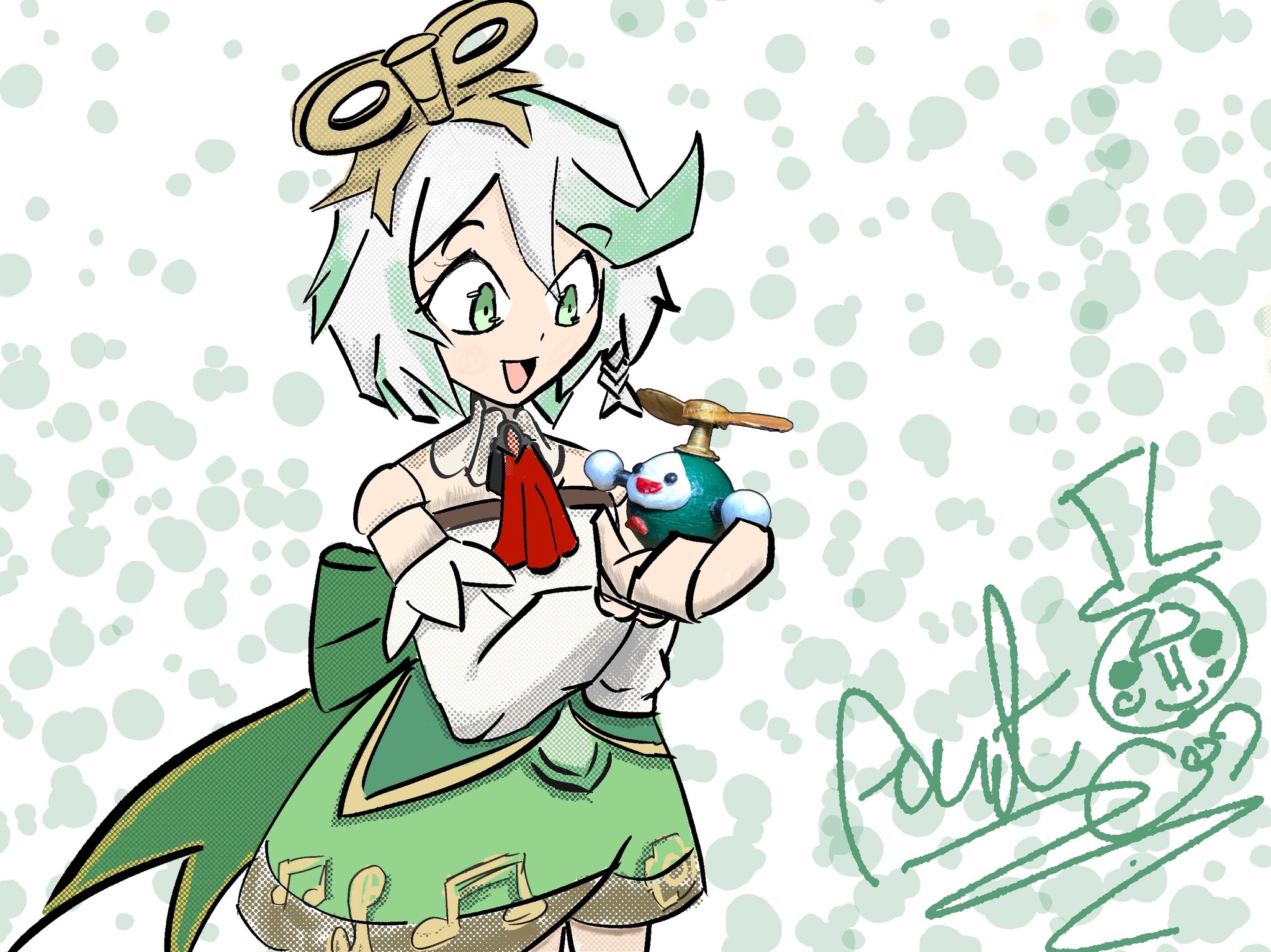 1girlartist clockmancorsetdoll jointsgreen corsetgreen eyesgreen hairgreen streaksjointsmulticolored hairopen mouthrompershort hairsimple backgroundsmilestrapless rompervirtual youtuberwhite hairwinding key