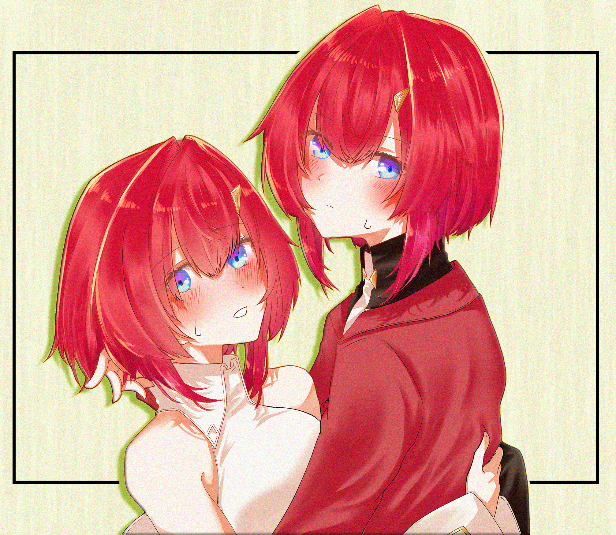 2girlsbare shouldersblack borderblue eyesblushborderbreastscardiganclosed mouthcollared shirtcolored shadowdrop shadowdual personagreen backgroundhair between eyeshair intakeshair ornamenthand in another's hairhand uphuginset borderlooking at viewerlooking to the sidemultiple girlsopen mouthpokkii (orikaden01)red cardiganred hairshadowshirtshort hairsleevelesssleeveless shirtsmall breastssweatdroptriangle hair ornamentvirtual youtuberwhite mouthwhite shirt