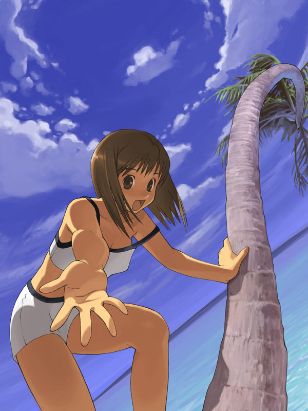 1girlarm supportbeachbrown eyesbrown haircloudcoconut treecrop topdaydutch anglefeet out of framefemale focusforeshorteninglooking at viewermidriffoceanopen mouthoutdoorspalm treeshort hairshortsskysmilesolostrap sliptank toptreetropicalwhite shorts