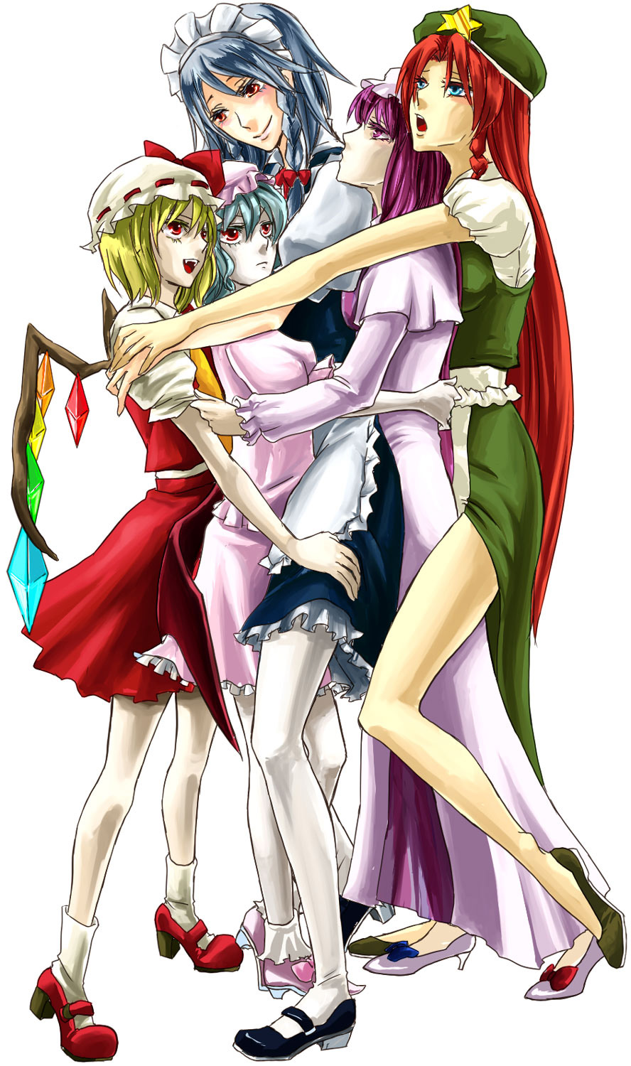 maroppe, alice margatroid, hakurei reimu, ibuki suika, izayoi sakuya, kamishirasawa keine, kirisame marisa, konpaku youmu, saigyouji yuyuko, shameimaru aya, touhou, 6+girls, blue dress, dress, female focus, film, hat, horns, letterboxed, long hair, looking at viewer, multiple girls, puffy short sleeves, puffy sleeves, red eyes, short sleeves, sidelocks, solo focus, tate eboshi, tokin hat, very long hair, wink