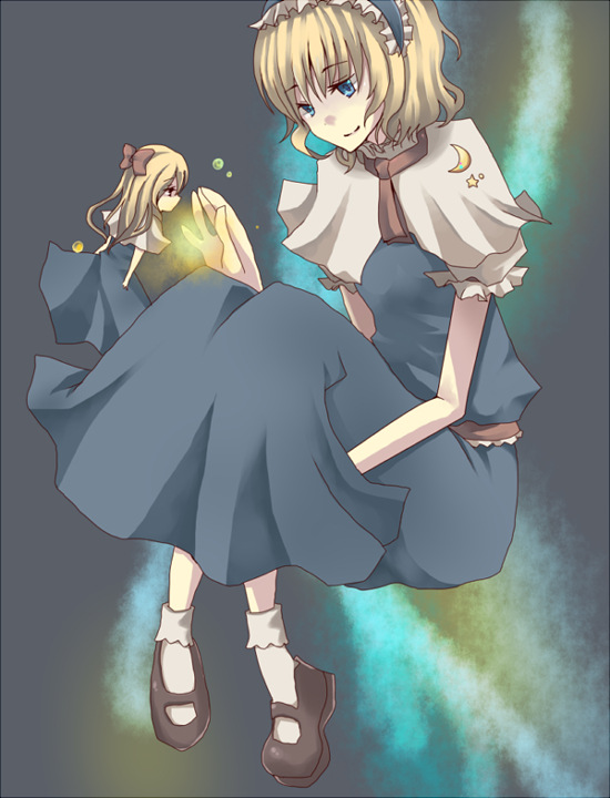 1girlbeltblonde hairblushcapeletclosed mouthdollfemale focusflyinghairbandlong hairmary janesshoesshort hairsittingsize differencesmilesockssolovery long hairwhite socks