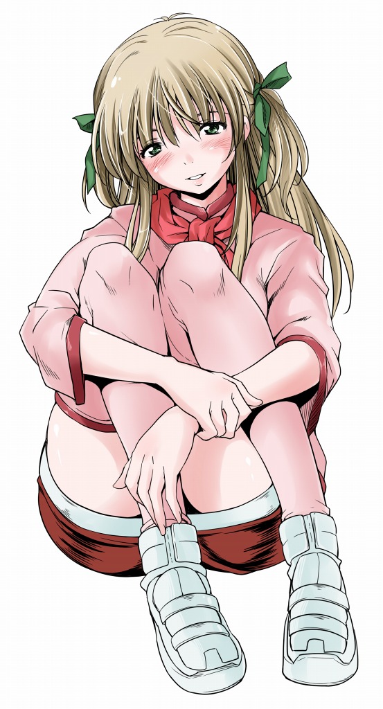 00s1girlblonde hairblushbrown hairconvenient legfemale focusgreen eyeslong hairparted lipspink shirtribbonshirtsimple backgroundsittingsmilesolothighhighstwo side upwhite background