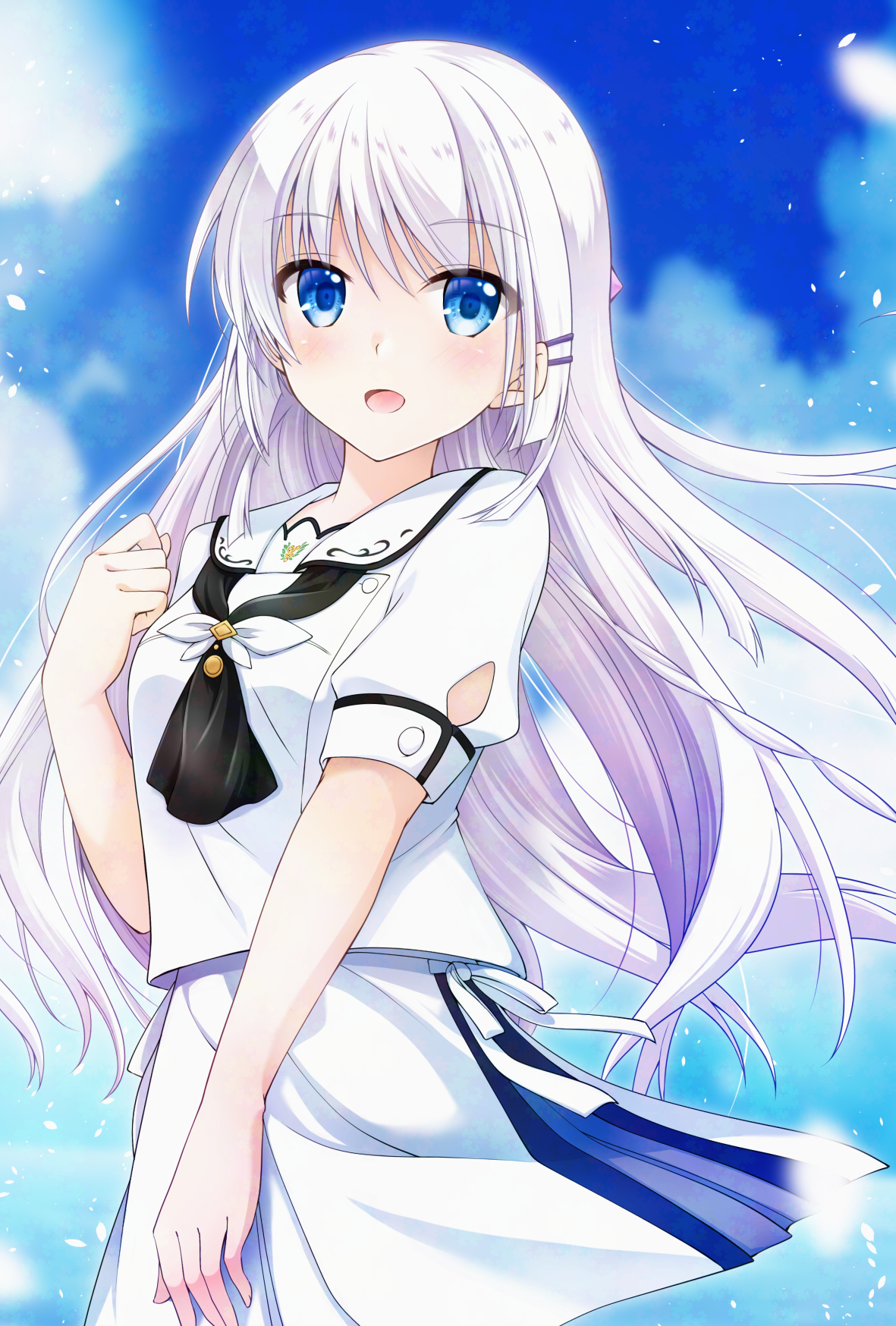 :d1girlascotblack ascotblue eyesblue skyblunt endsblurryblurry backgroundblushclenched handcowboy shotdayfloating hairhair behind earhair between eyeshair ornamenthaircliphand uphappylight particleslong hairlooking at viewerminiskirtopen mouthoutdoorsparallel hairclipspuffy short sleevespuffy sleevessailor collarschool uniformserafukushirtshort sleevessidelocksskirtskysmilesolosummer pockets school uniformvery long hairwhite hairwhite sailor collarwhite serafukuwhite shirtwhite skirt