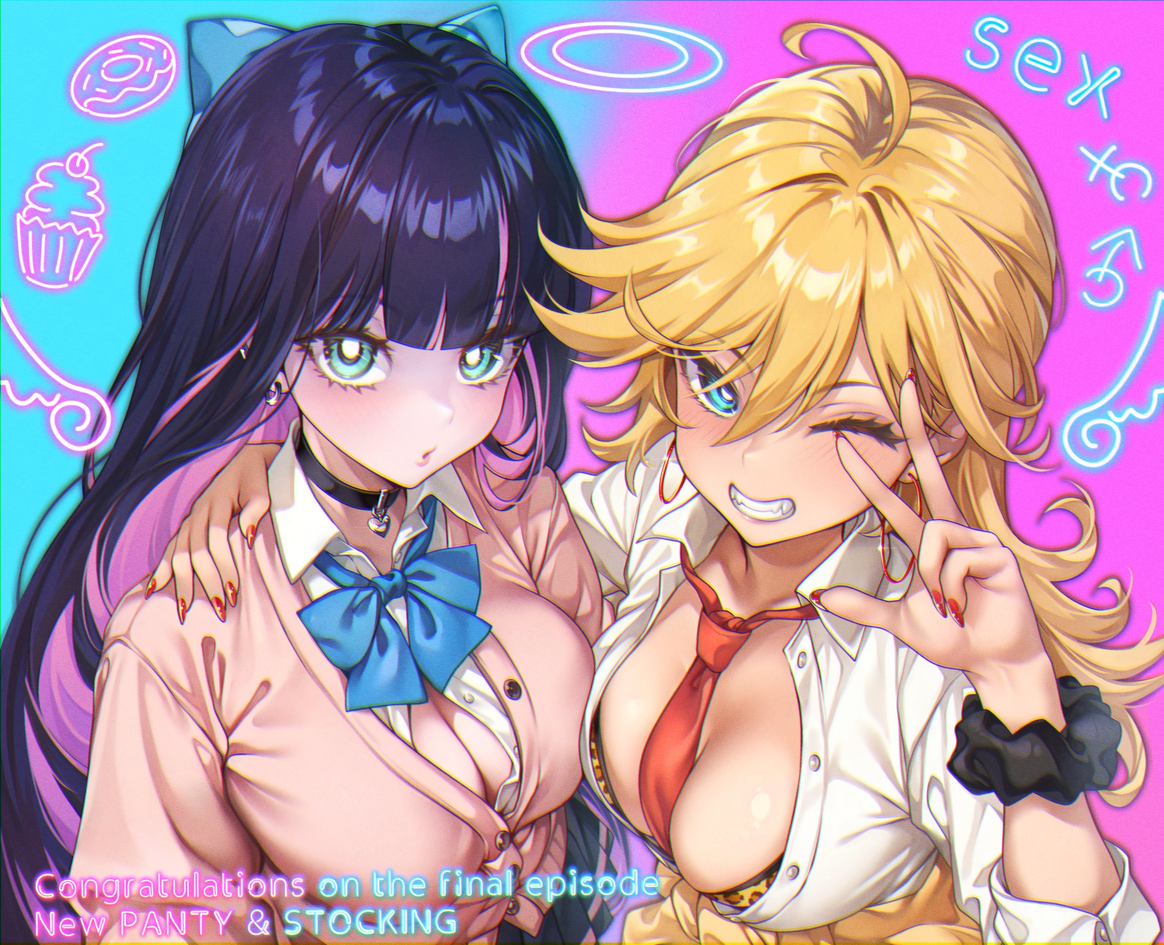 :d2girlsahogeanimal printbetween breastsblack chokerblack hairblack sclerablonde hairblue backgroundblue bowblue bowtieblue eyesbowbowtiebrabra peekbreastsbright pupilscardiganchokercleavagecollared shirtcolored inner haircolored scleracongratulationscopyright nameearringsgrinhair bowhand on another's shoulderhand upheartheart chokerhoop earringsjewelrylarge breastsleopard printlooking at viewermars symbolmulticolored hairmultiple girlsnecktienecktie between breastsone eye closedopen mouthparted lipspartially unbuttonedpink backgroundpink cardiganpink hairred nailsred necktiescrunchieshirtsiblingssisterssmiletwo-tone backgroundunderwearvenus symbolwwhite pupilswhite shirtwrist scrunchie