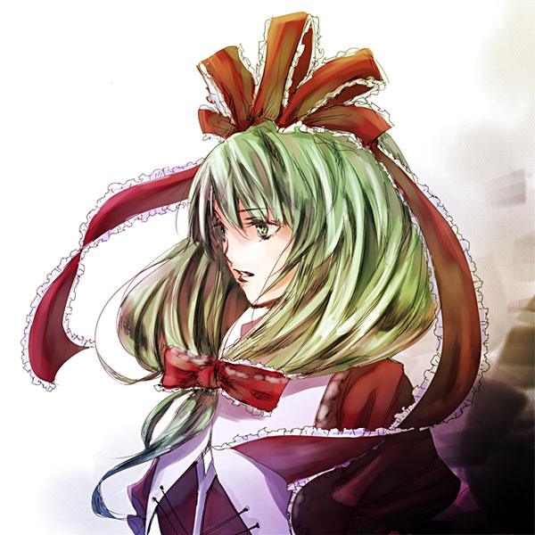 1girlbowdressexpressionlessfemale focusfront ponytailgreen eyesgreen hairhair bowmatching hair/eyespale skinred bowred dressshort hairsoloupper body