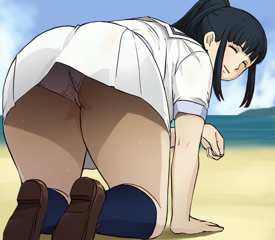1girlall foursassbeachblack hairclosed eyescurvydayfemale focuspantiespaw poseplumpsmilesockssolounderwear