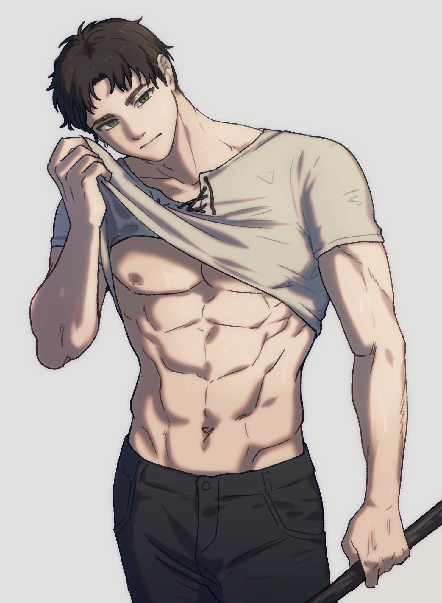 1boyabsblack pantsbrown hairclosed mouthclothes liftcowboy shotgreen eyesgrey backgroundholdingholding stickmale focusmuscularmuscular malenavelpantsparted bangspectoralsshirtshirt liftshort hairshort sleevessolosticksweatwhite shirtwiping sweat