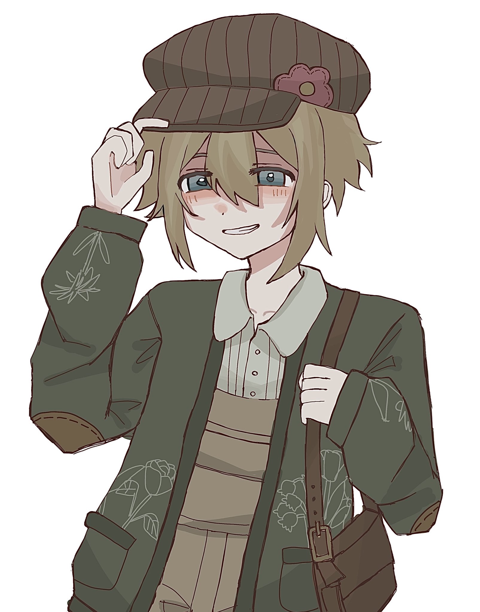 1boyadjusting clothesadjusting headweararm upblonde hairblue eyesblushbrown hatbrown overallscardiganclose 143collared shirtdouble-parted bangsgreen cardigangrinhair between eyeshatlong sleeveslooking at viewermale focusnewsboy capoverallsparted lipsshirtsidelockssimple backgroundsmilesoloteethwhite backgroundwhite shirt