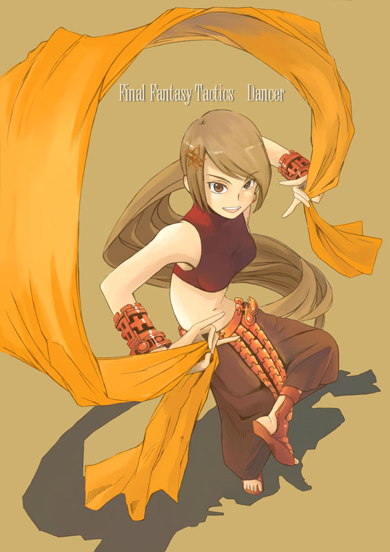 1girlblonde hairbrown eyesbrown hairfemale focuslong hairmidriffopen mouthsandalssmilesolovery long hair
