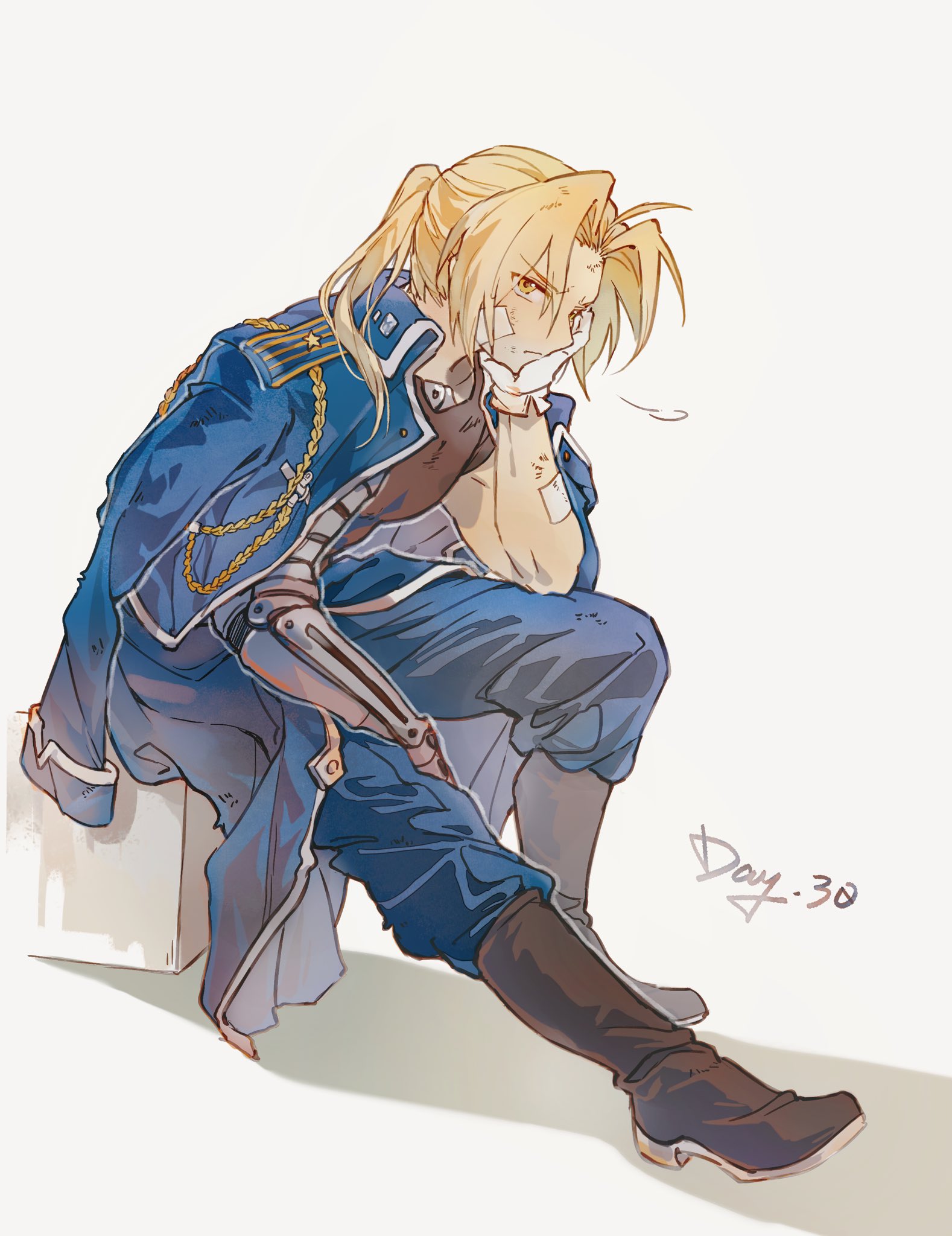 1boyahogebandaidbandaid on armbandaid on cheekbandaid on faceblack shirtblonde hairblue jacketblue pantsbootsbrown bootsdirtydirty facefrownfull bodyfurrowed browgloveshead on handjacketjacket on shoulderslong hairmale focusmechanical armsmilitary jacketmilitary uniformpantsparted bangsponytailprosthesisprosthetic armshirtsingle mechanical armsittingsolowhite backgroundwhite glovesyellow eyes