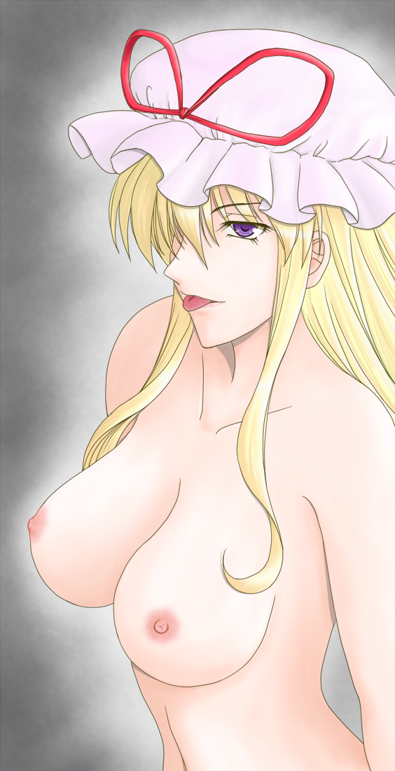 :p1girlblonde hairbreastscompletely nudefemale focusgradient backgroundhatlong hairnipplesnudepurple eyesribbonsolotonguetongue outupper body