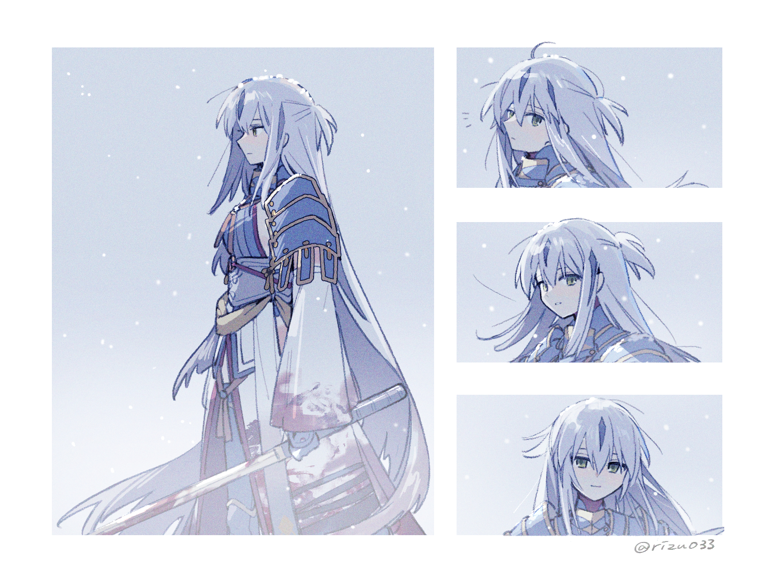 1girlarmorblack hairbloodblood on clothesbloody weapondetached sleevesgreen eyesholdingholding swordholding weaponjapanese armorjapanese clotheskimonolong hairlong sleeveslooking at viewermulticolored hairshoulder armorsidelockssleevelesssleeveless kimonosmilesnowingsodesolostreaked hairswordtwitter usernametwo-tone hairvery long hairweaponwhite hairwhite kimonowide sleeves