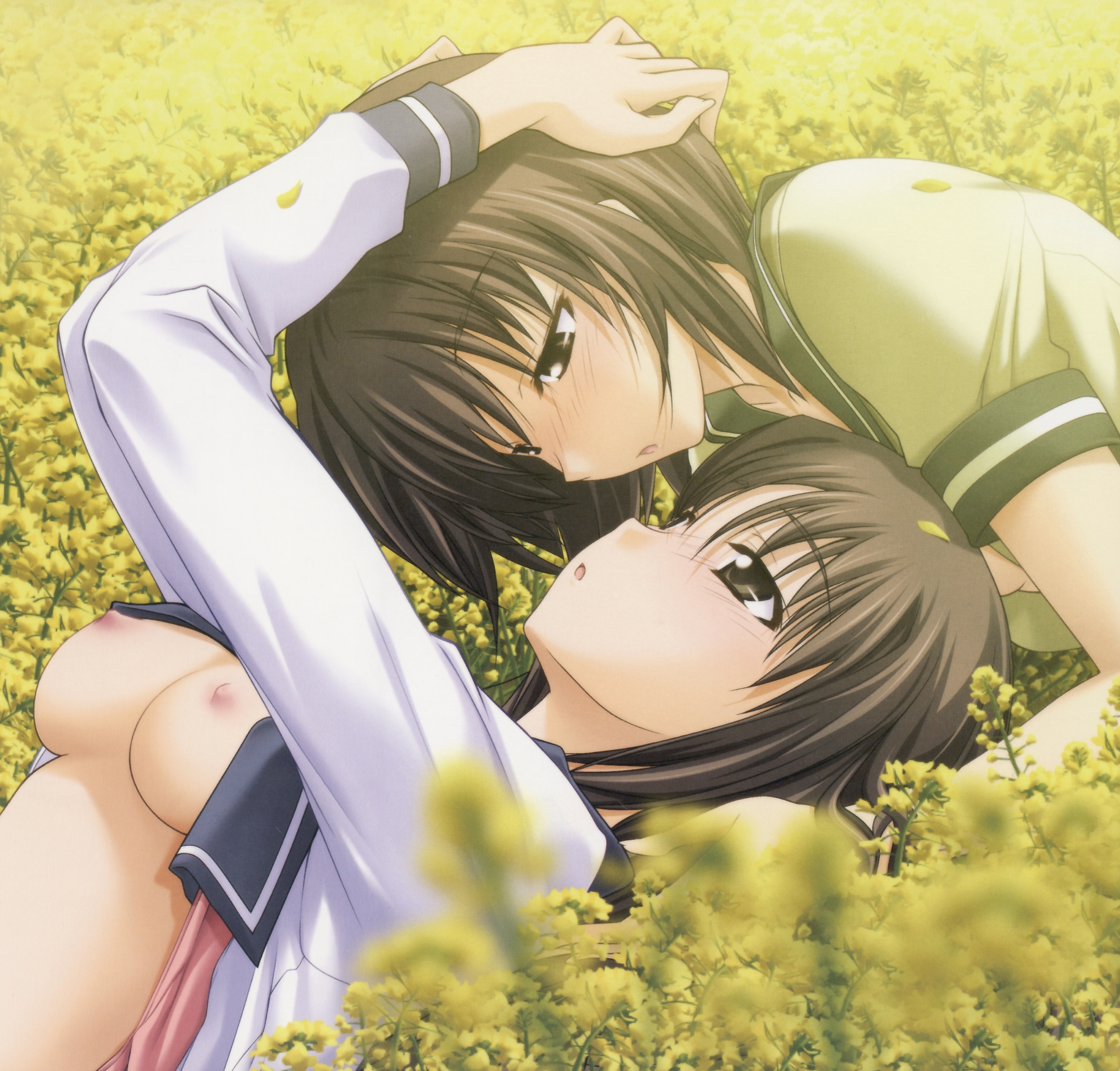hayase mitsuki, suzumiya akane, suzumiya haruka, kimi ga nozomu eien, 00s, 3girls, aqua eyes, blue eyes, blue hair, brown hair, day, dress, grass, green eyes, hug, long hair, multiple girls, orange hair, red hair, short hair, sky, sundress, tree