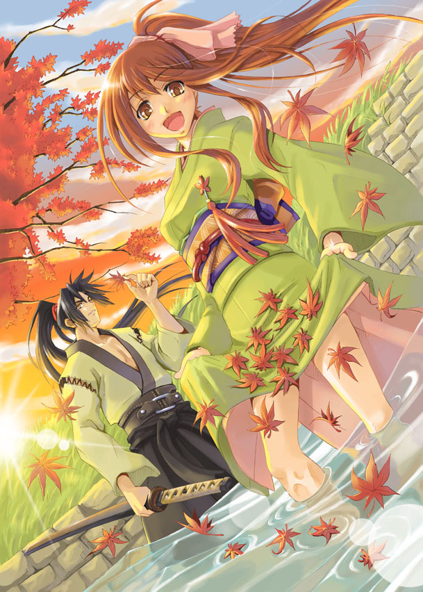 :d1boy1girlbrown eyesdutch anglejapanese clotheskatanakimonoleaflong hairmaple leafobiopen mouthorange hairponytailsamuraisashsheathsheathedskirt holdsmileswordwadingwaterweapon