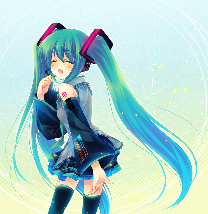 aqua hairdetached sleeveslong hairmicrophonenecktieskirtsmilesolothighhighstwintailszettai ryouiki