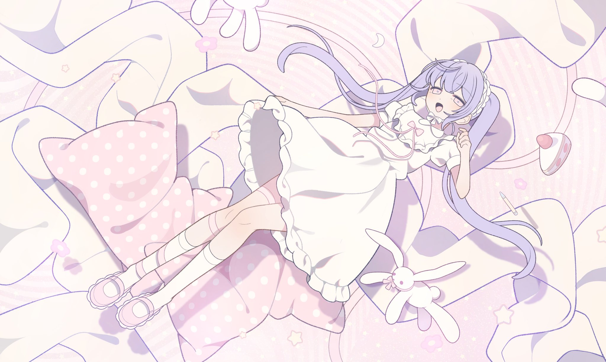 :d1girlbonnetbowbowtiecakecake slicedressflowerfoodfrilled bonnetfrilled dressfrillsfrom abovefruitfull bodyhair between eyeshand upkneehighslong legslyingmary janesmedium dresson backopen mouthpencilpillowpink backgroundpink bowpink bowtiepink eyespink flowerpink shoespuffy short sleevespuffy sleevespurple hairshadowshoesshort sleevessimple backgroundsmilesockssolostar (symbol)strawberrystrawberry cakestuffed animalstuffed rabbitstuffed toythigh straptonguetwintailswhite bonnetwhite bowwhite dresswhite socks