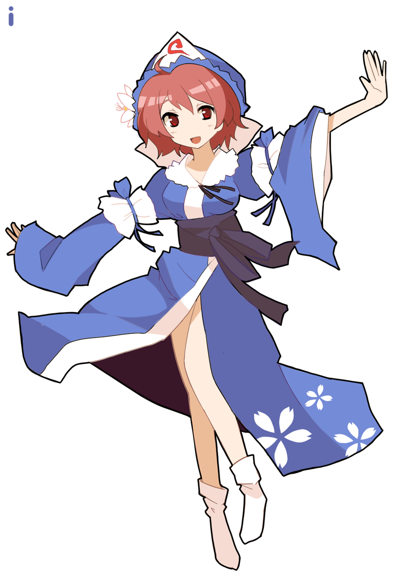 :d1girlahogeblue hatblue kimonobreastscollardressfemale focusfloral printflowerfull bodyhair flowerhair ornamenthatjapanese clotheskimonolegslong sleeveslotusobiopen mouthpink hairred eyessashshort hairsimple backgroundsleeves past wristssmilesockssolotriangular headpiecewhite backgroundwhite collarwhite sockswide sleeves