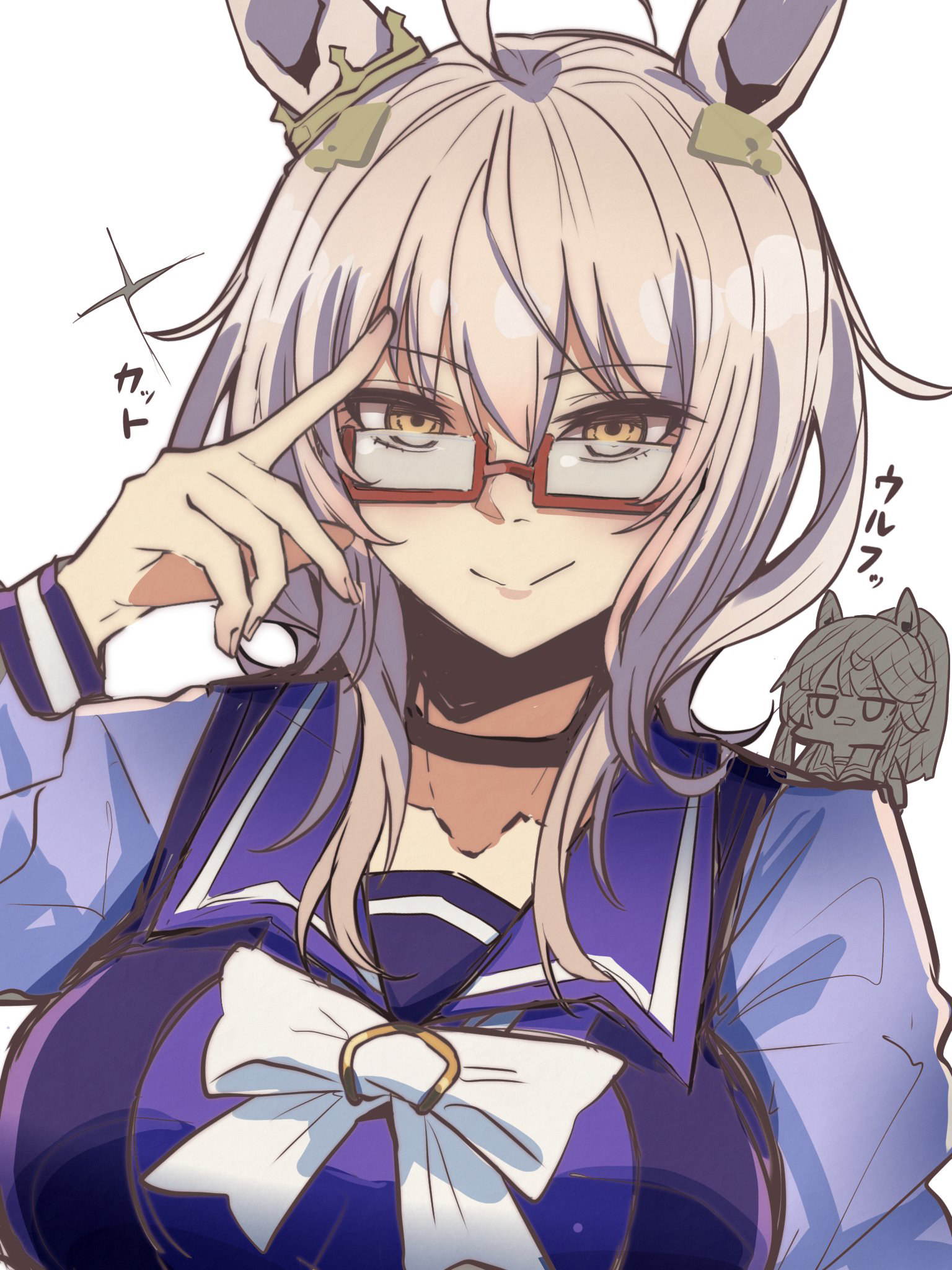 2girlsahogeanimal earsbowbreastsbrown eyesbrown hairchibiclosed mouthhair between eyeshorse earslarge breastslong sleeveslooking at viewermultiple girlspuffy long sleevespuffy sleevespurple shirtred-framed eyewearschool uniformsemi-rimless eyewearshirtsimple backgroundsmilesolo focustracen school uniformunder-rim eyewearwhite backgroundwhite bow