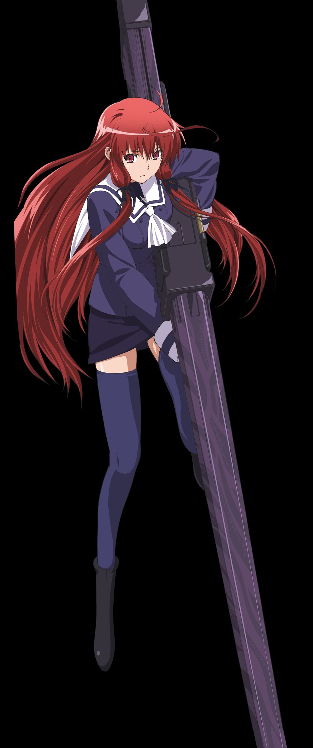 00s1girlfemale focusgunhuge weaponlong hairred eyesred hairskirtsolothighhighsvery long hairweapon