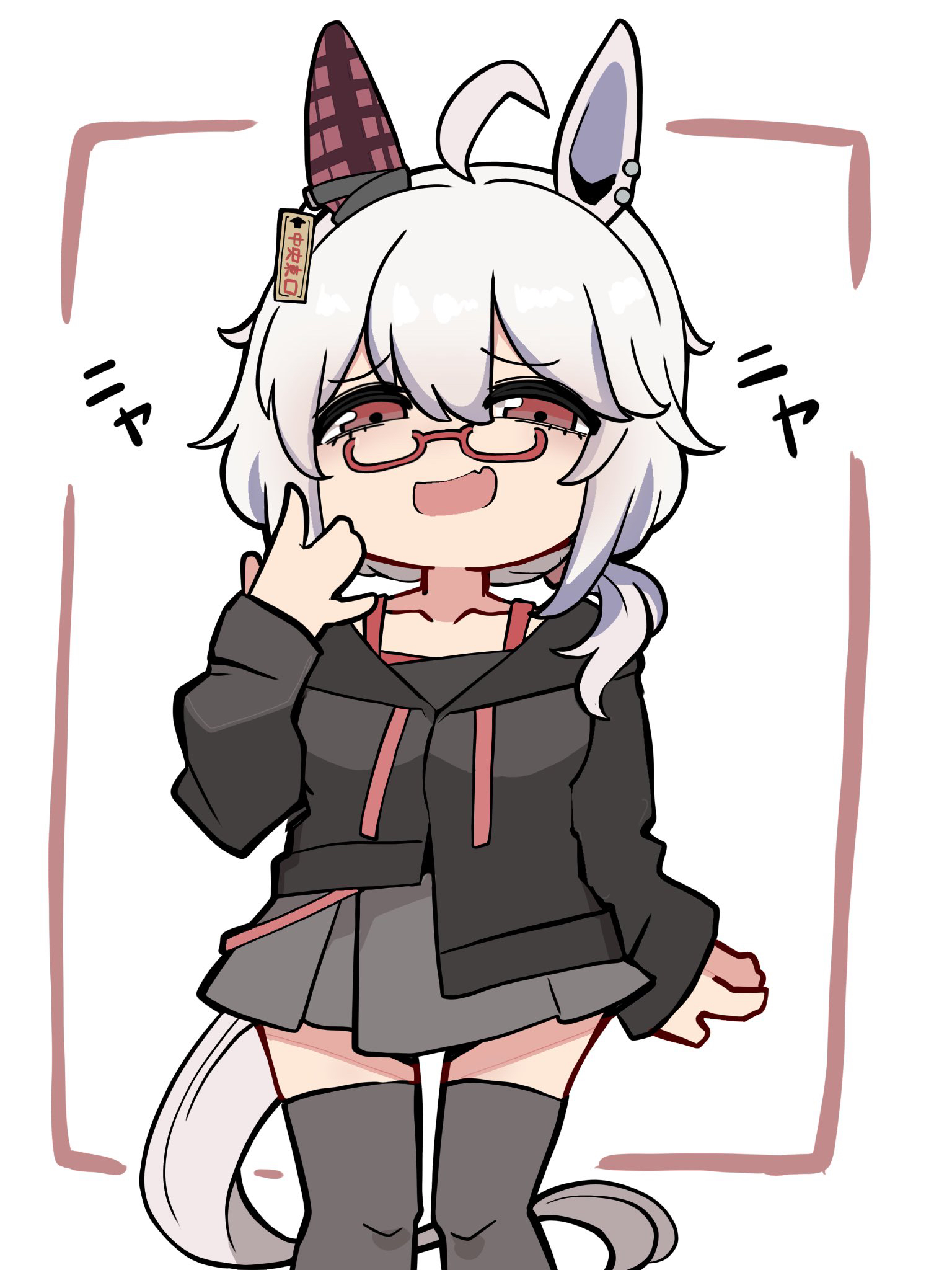 :d1girlahogeanimal earsblack jacketfangfeet out of frameglassesgrey hairgrey skirtgrey thighhighshair between eyeshand uphorse earshorse girlhorse tailjacketlong sleeveslooking at vieweropen mouthpleated skirtred eyesred-framed eyewearsemi-rimless eyewearskirtsleeves past wristssmilesolostandingtailthighhighsunder-rim eyewearwhite background