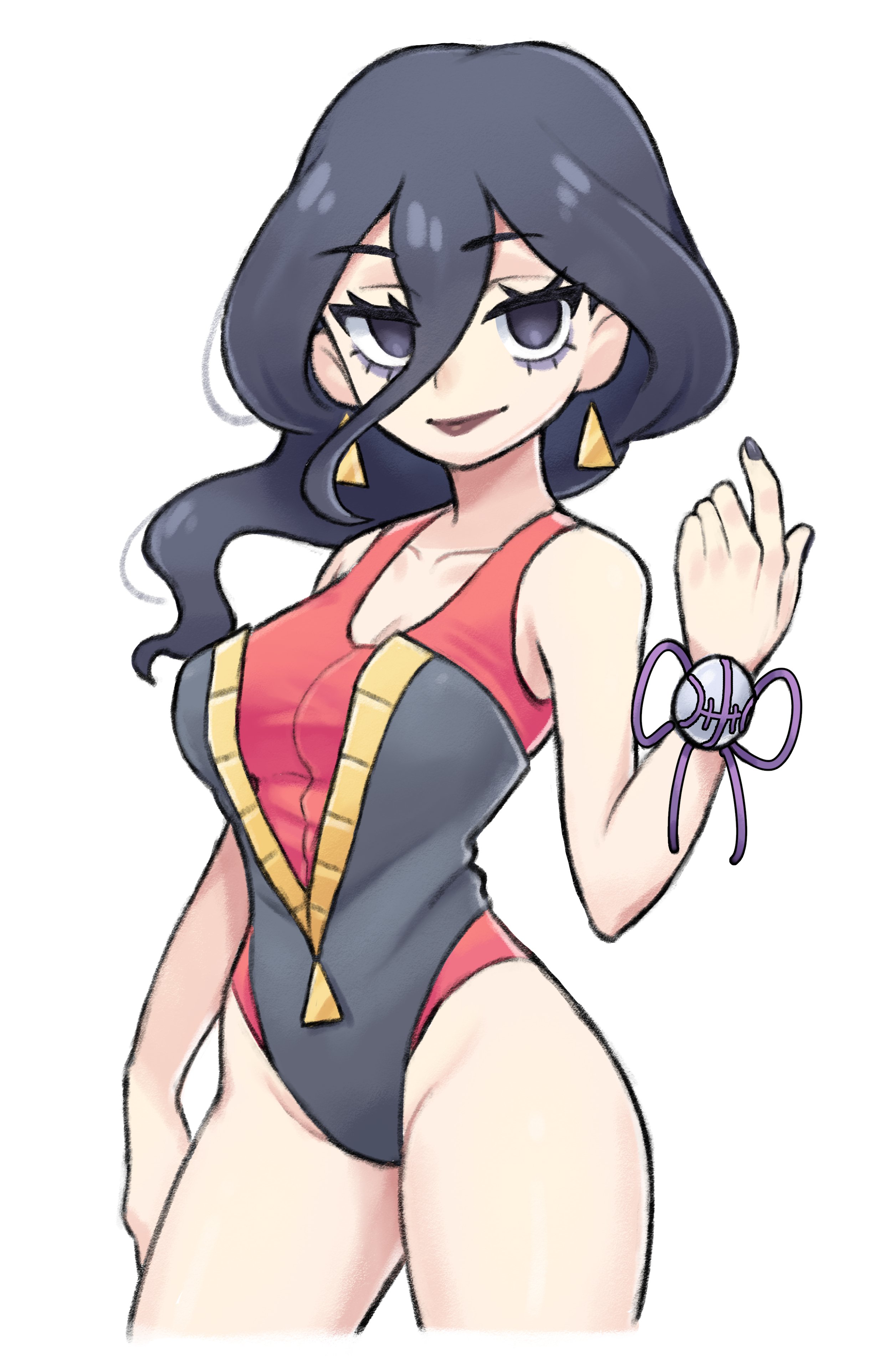 1girlalternate breast size (larger)bags under eyesbare shouldersblack hairbraceletbreastsclosed mouthcollarbonecosplaycowboy shotearringsgen 3 pokemonhair between eyesjewelrylarge breastslong hairlooking at viewermega banette (cosplay)mega pokemonone-piece swimsuitpurple ribbonribbonsimple backgroundsmilesoloswimsuitwhite background