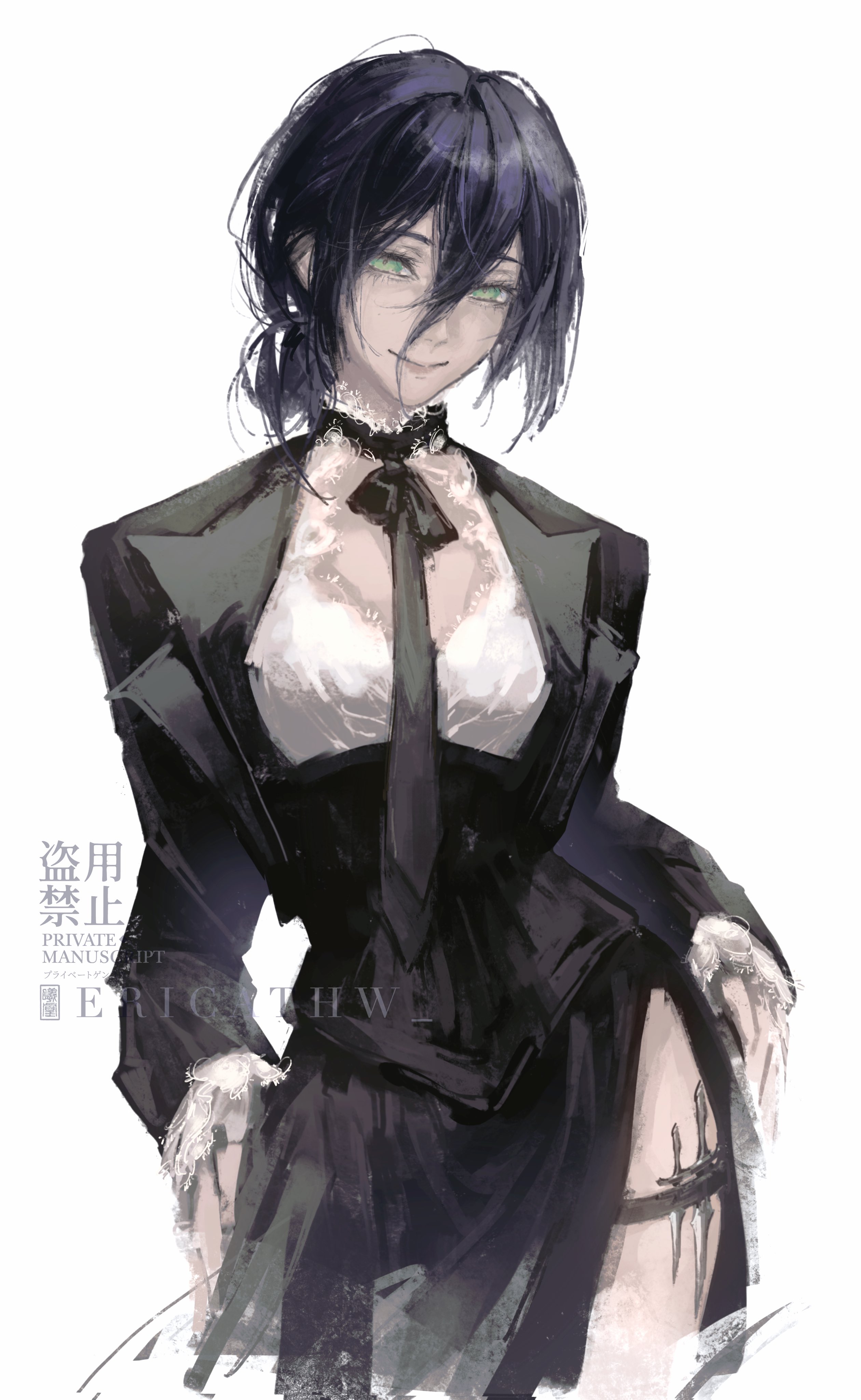 ochiaki, kanoe (blue archive), blue archive, commentary request, highres, 1girl, black dress, black pantyhose, brown ribbon, buttons, collared shirt, diagonal-striped ribbon, double-breasted, dress, flat chest, furrowed brow, grey hair, hair over one eye, halo, hands up, heart, heart hands, long bangs, long hair, long sleeves, looking at viewer, mary janes, messy hair, mojyo, nervous smile, orange eyes, orange halo, own hands together, pale skin, pantyhose, parted bangs, pinafore dress, puffy long sleeves, puffy sleeves, ribbon, scar, scar on neck, shirt, shoes, short twintails, sidelocks, simple background, sitting, sleeve cuffs, sleeveless, sleeveless dress, smile, solo, sphere hair ornament, twintails, very long hair, wariza, white background, white shirt