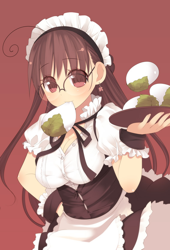 breastsbrown eyesbrown hairfoodglasseskashiwa mochi (food)large breastslong hairmaidmochimouth holdsolowagashi