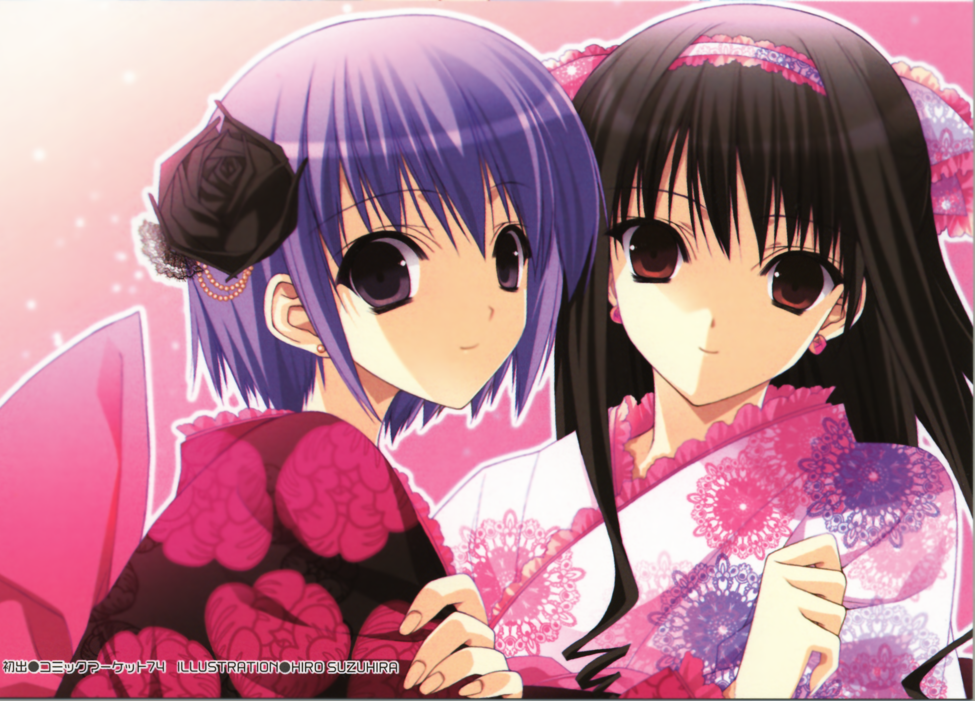 2girlsbrown hairjapanese clotheslolita fashionlong hairmultiple girlspurple eyespurple hairred eyesshort hairwa lolitayuri