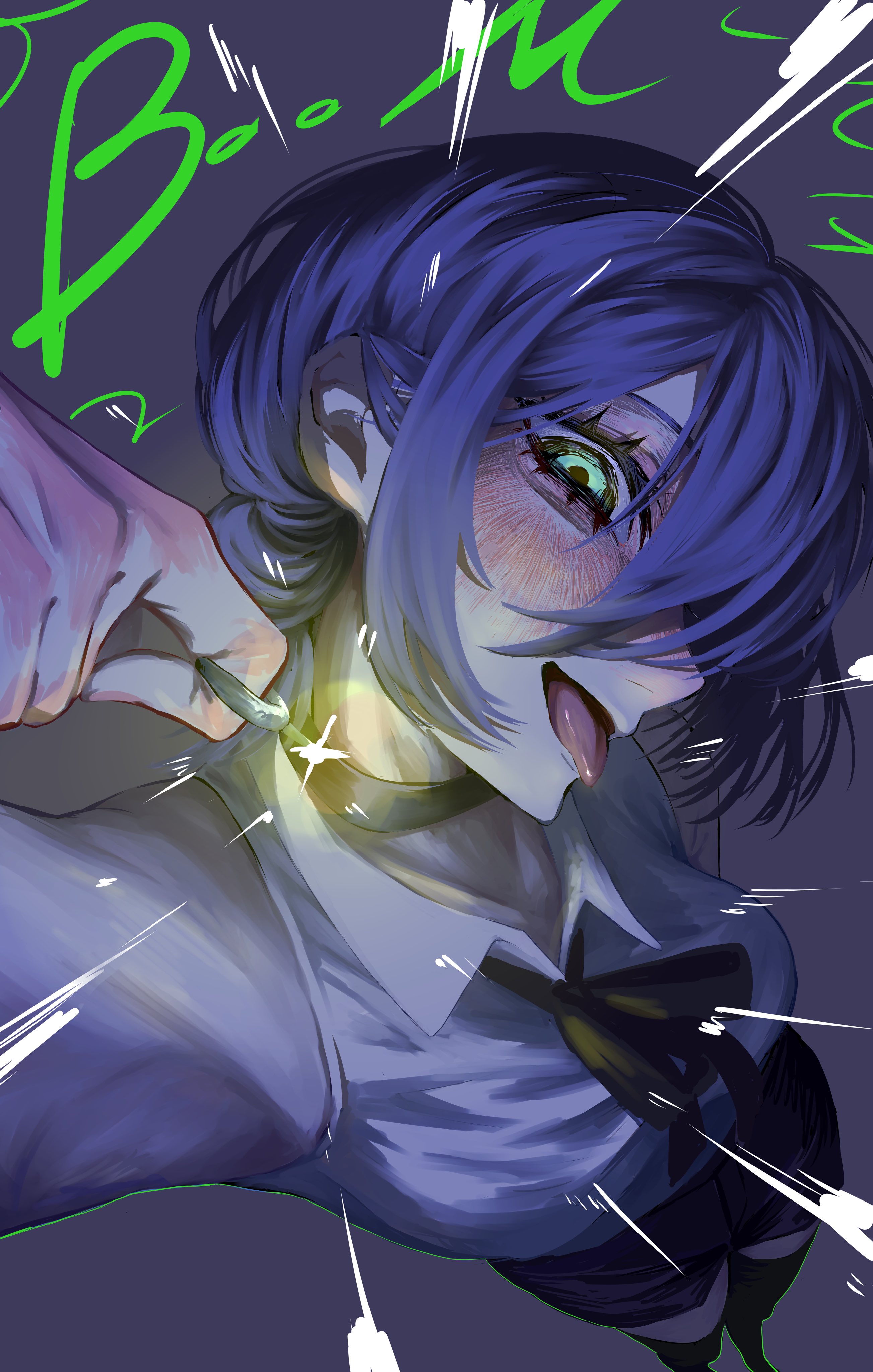 1girlarmpitsblack ribbonblack shortsblack thighhighsblue hairblushbuzz noufrom abovegreen eyesgrenade pingrey shirtimminent explosionlooking at viewerneck ribbonopen mouthribbonshirtshortssleevelesssleeveless shirtsolosparksthighhighstonguetongue out