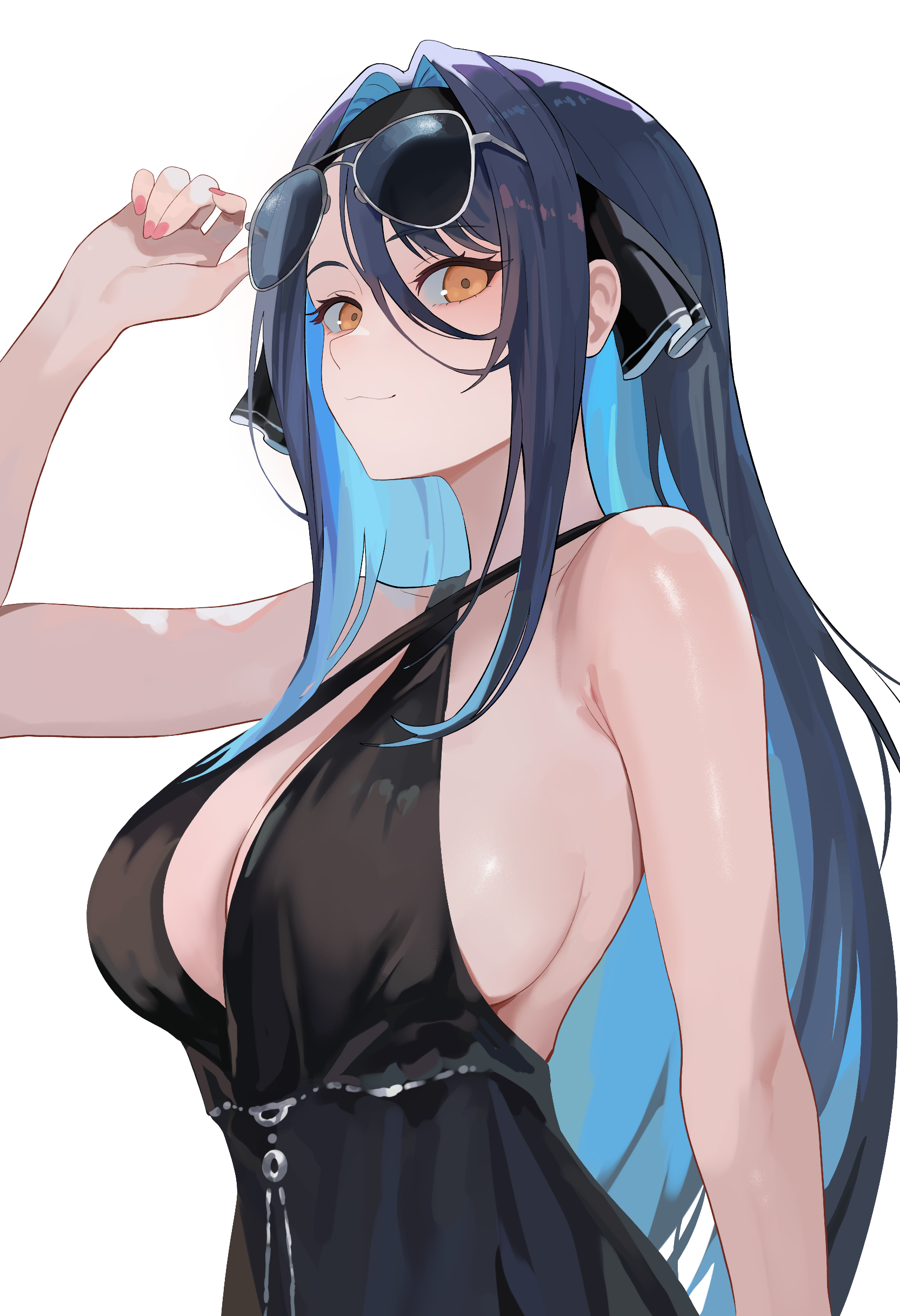 :31girladjusting eyewearbare shouldersblack dressblue hairbreastscleavageclosed mouthcollarbonecolored inner haircriss-cross halterdresshair between eyeshair intakeshalterneckhand uplarge breastslong hairlooking at viewermulticolored hairnail polishorange eyespink nailssideboobsidelockssimple backgroundsleevelesssleeveless dresssmilesolostandingsunglassesupper bodyvery long hairvirtual youtuberwhite background