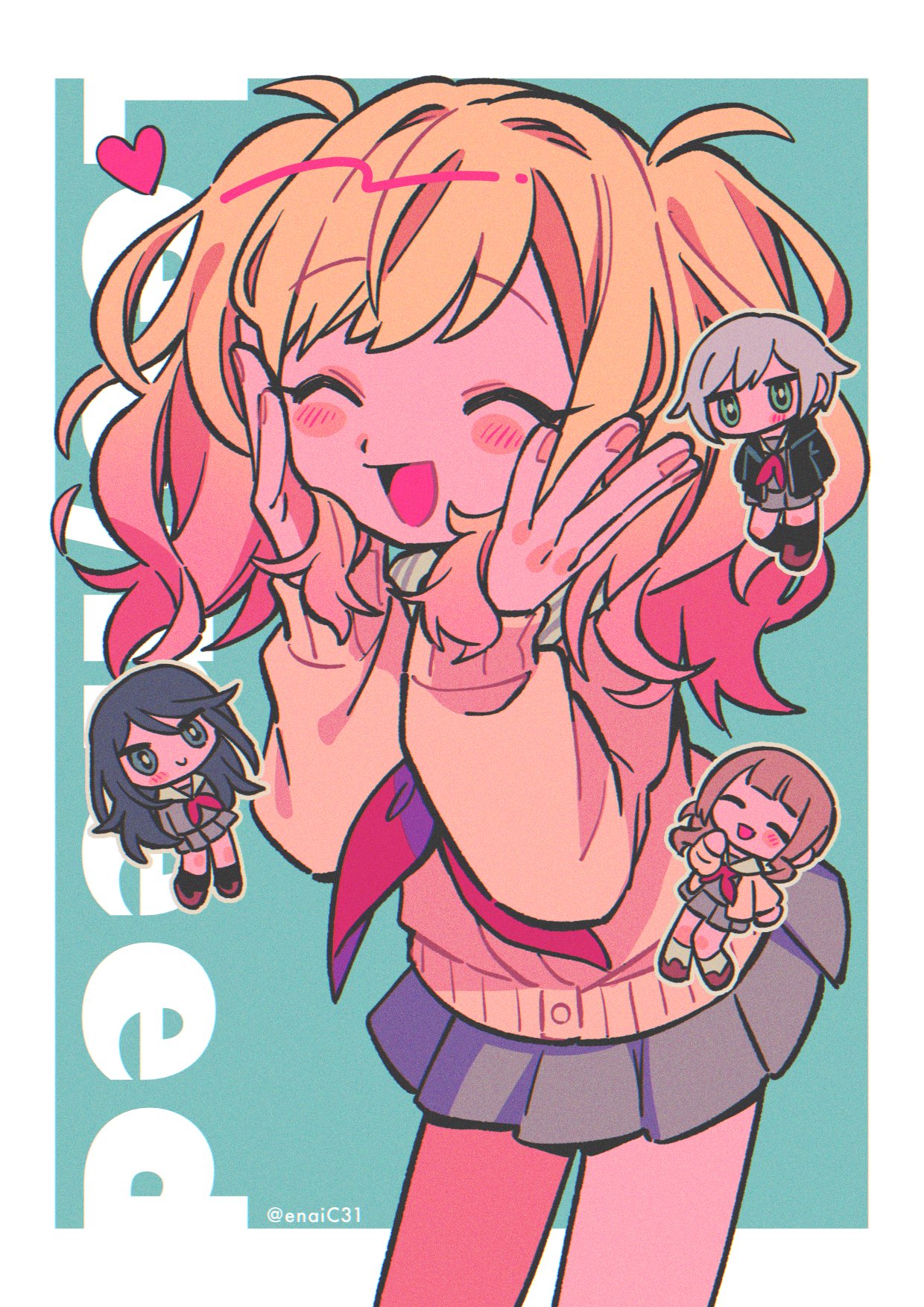 :d1boy4girlsaqua backgroundblack hairblonde hairblue eyesborderbright pupilsbrown haircardiganchibichibi insetchromatic aberrationclosed eyescowboy shotdouble-parted bangsfaux retro artstylefilm grainfingernailsgradient hairgreen eyesgrey hairgrey skirthair between eyeshands on own cheekshands on own facehands upleaning forwardleo/need (project sekai)long hairlong sleevesminiskirtmiyamasuzaka girls' academy school uniformmulticolored hairmultiple girlsneckerchiefopen mouthoutlineoutside borderpink hairpleated skirtpuffy long sleevespuffy sleevesred neckerchiefsailor collarschool uniformshort hairsimple backgroundskirtsmilesolo focusstandingswept bangstonguetwintailstwitter usernametwo-tone hairwhite borderwhite outlinewhite pupilswhite sailor collaryellow cardigan
