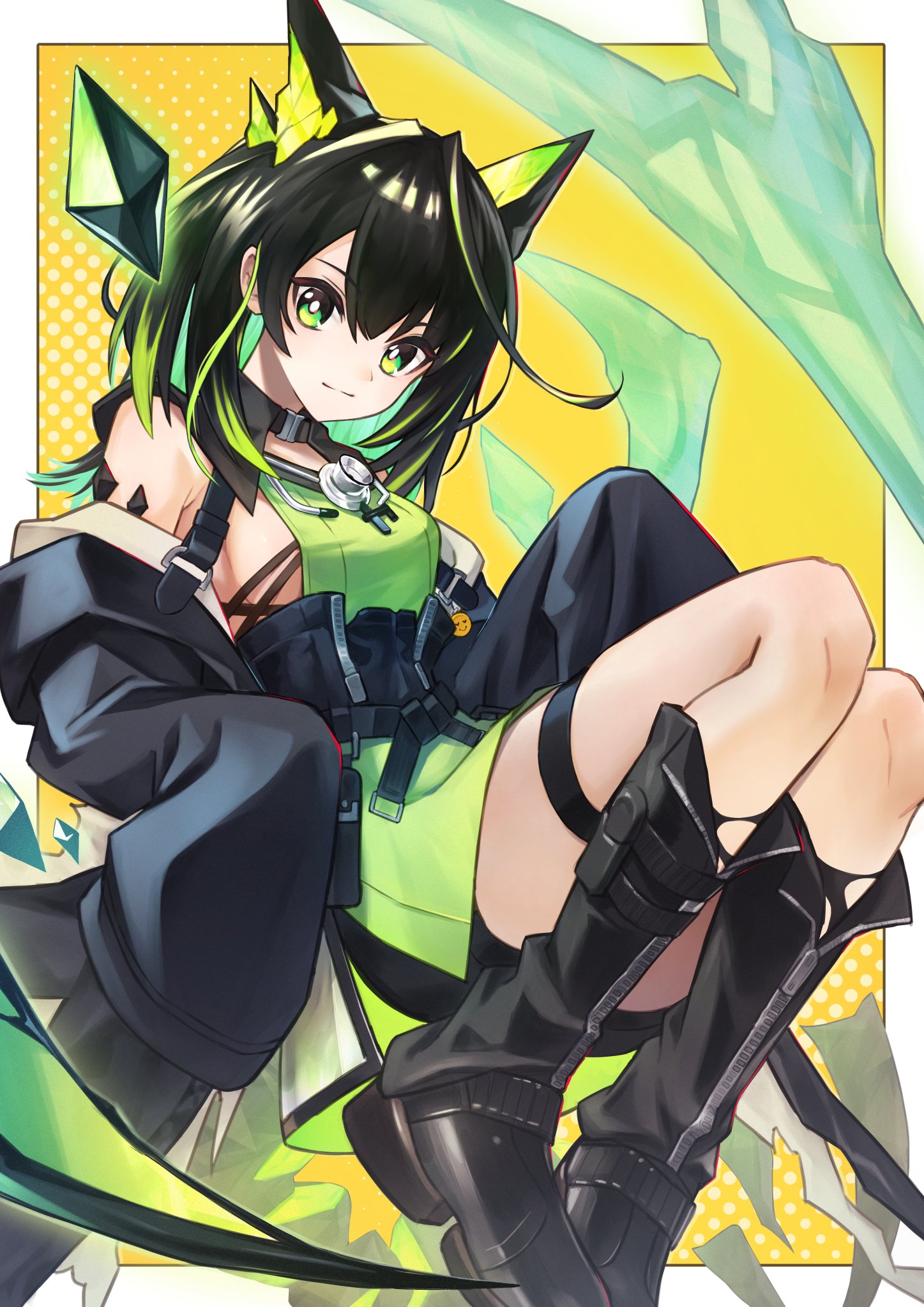 1girlahogebare shouldersblack bootsblack hairblack jacketbootsbright pupilsclosed mouthcolored inner haircrystalemojifloatingfull bodygreen eyesgreen hairhuge ahogejacketknee bootsknees uplight smilelong hairlooking at viewermaterial growthmulticolored hairoff shoulderoripathy lesion (arknights)solowhite pupils