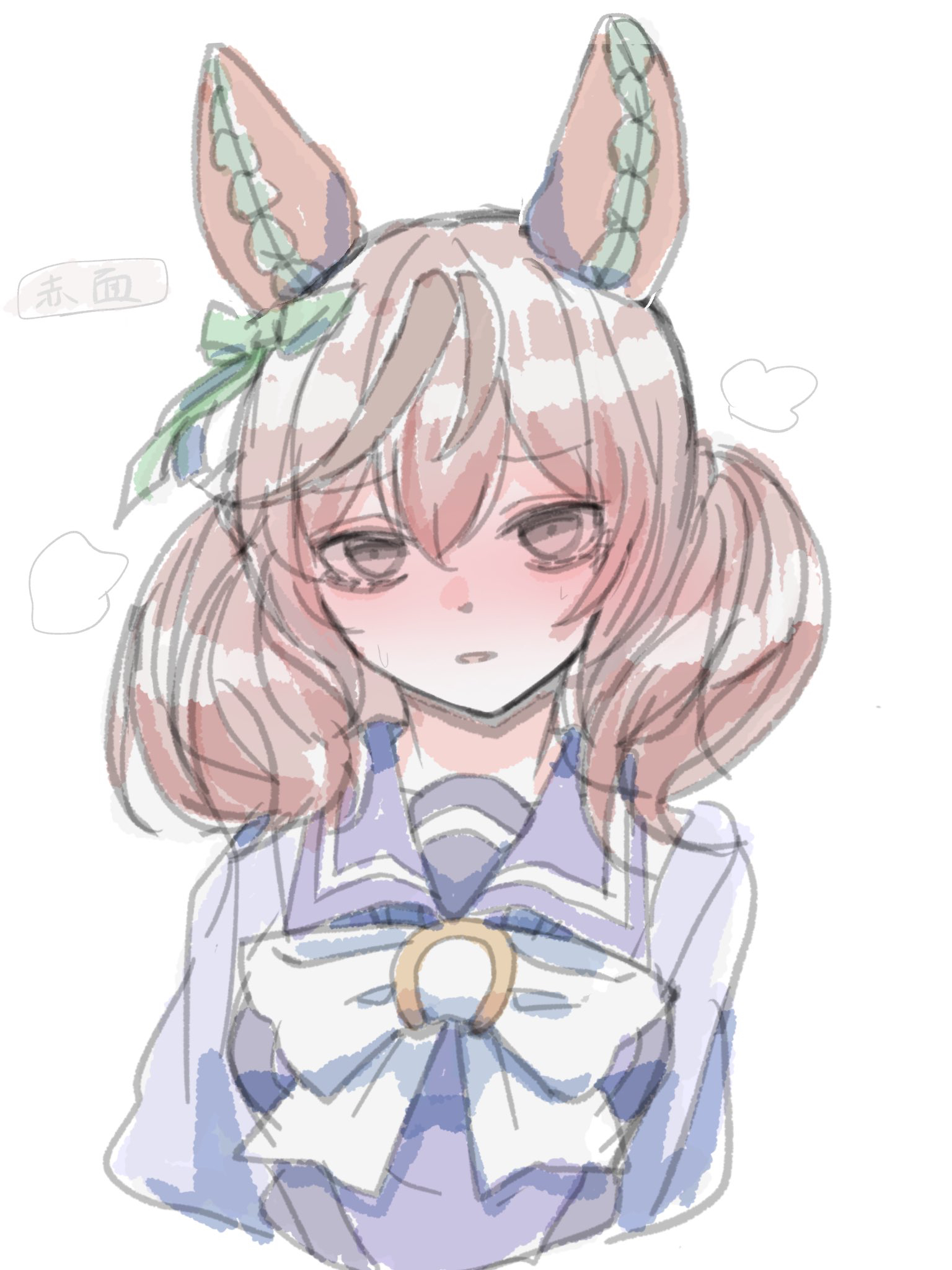 1girlanimal earsblushbowbreastsbrown eyesbrown haircropped torsoear bowgameplay mechanicsgreen bowhair between eyeshorse earslong sleeveslooking at viewermulticolored hairnose blushparted lipspuffy long sleevespuffy sleevespurple shirtshirtsimple backgroundsmall breastssolostreaked hairtwintailsupper bodywhite backgroundwhite bow